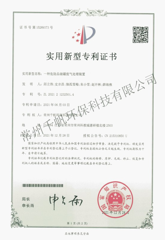 實(shí)用新型專利證書 一種危險(xiǎn)品儲罐廢氣處理裝置